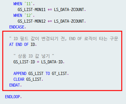 #4. AT END OF 구문을 통해 "기준"에 따라서 로직을 타게 해 주고 상품 ID 값을 넣어주자.