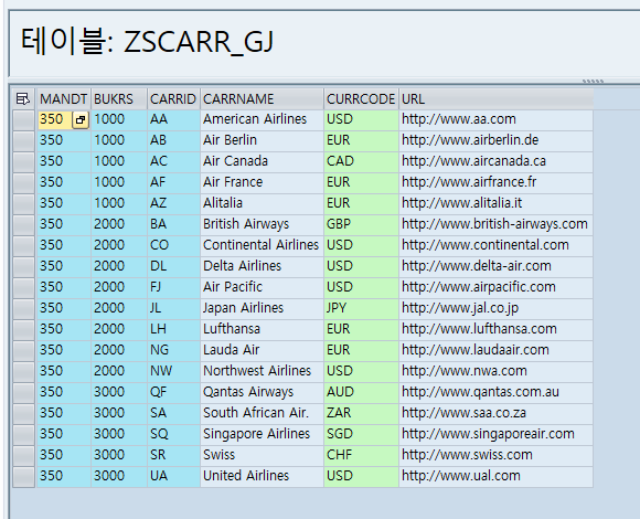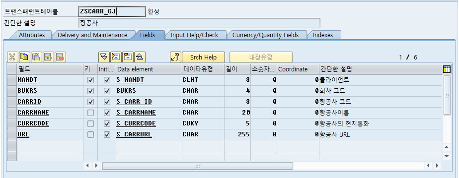 SCARR 복사, BUKRS(회사코드) 필드 추가한 ZSCARR_GJ Table이다.