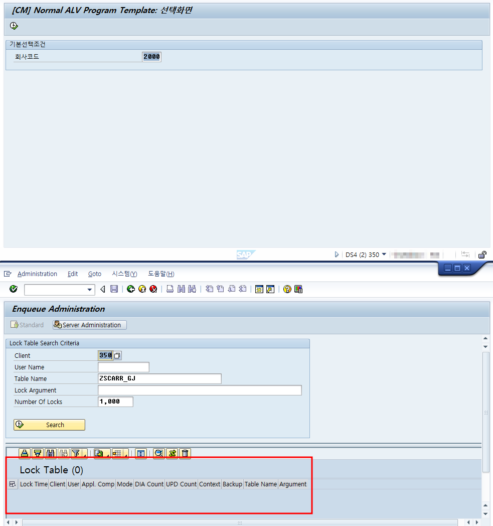 # 회사코드 : 2000에 값을 주었을 때 다음과 같이 Lock 잡혀있는 것을 볼 수 있다(빨간 상자)