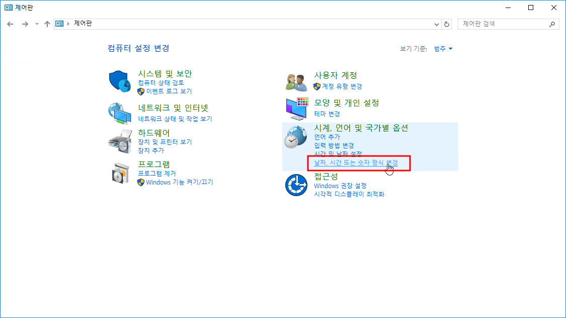 # 1. [제어판] -> [시계, 언어 및 국가별 옵션( 날짜, 시간 또는 숫자 형식 변경 )] 클릭