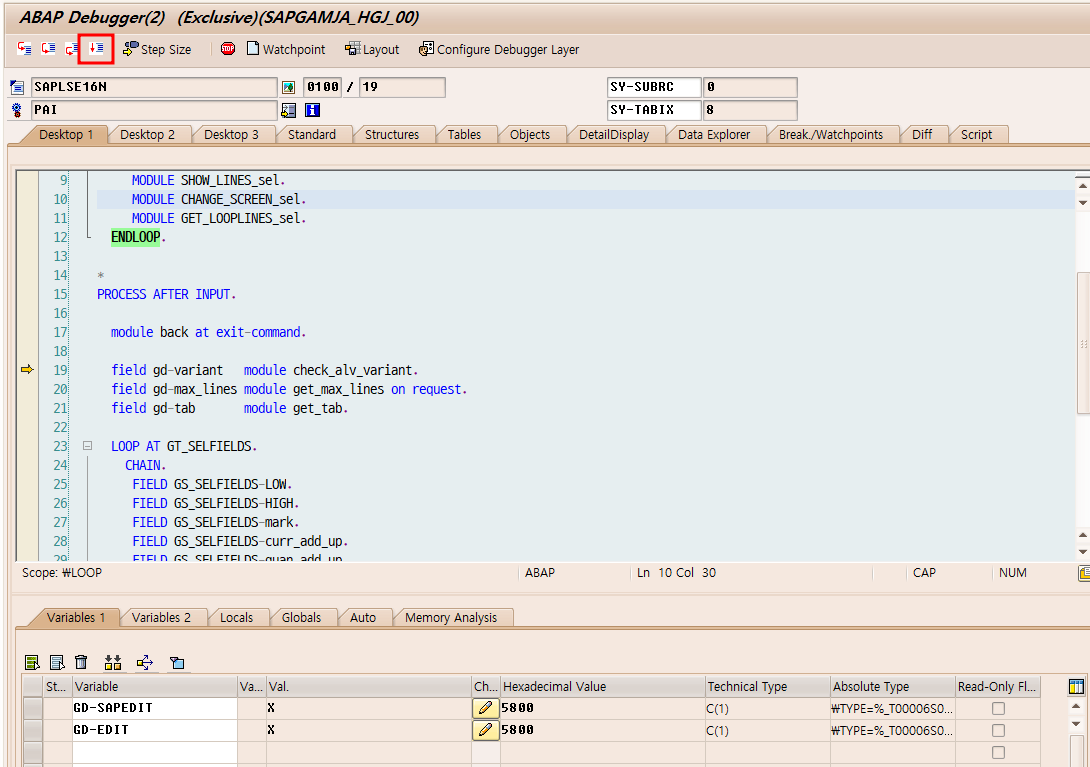 # 6. 그럼 다음과 같이 디버깅이 화면이 나오는데 밑에 있는 변수들의 값을 변경해야 한다.