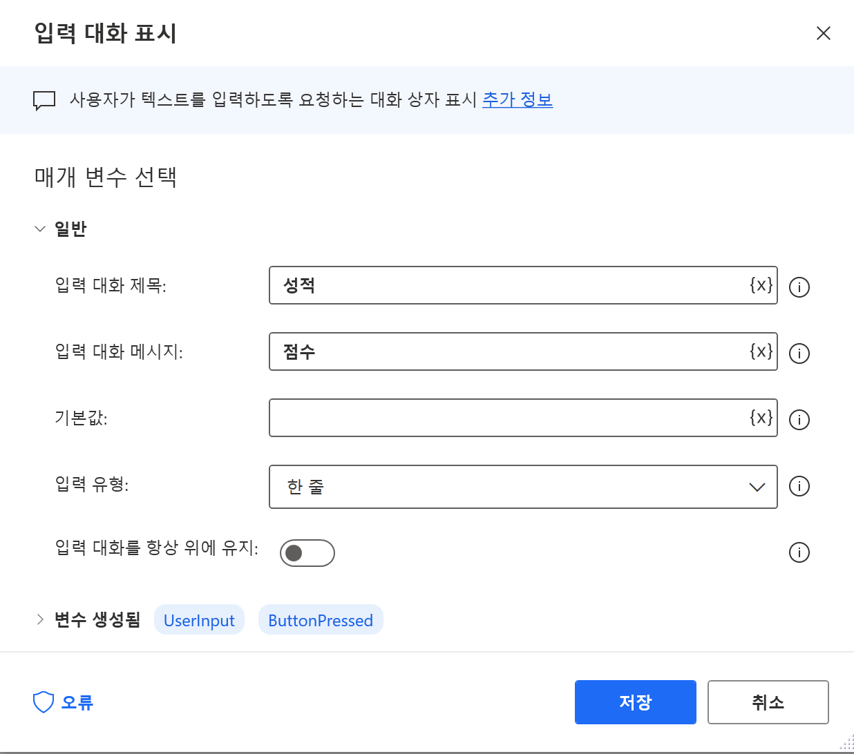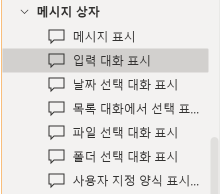 메시지 상자에서 입력 대화 표시를 드래그 앤 드랍으로 흐름에 넣는다.