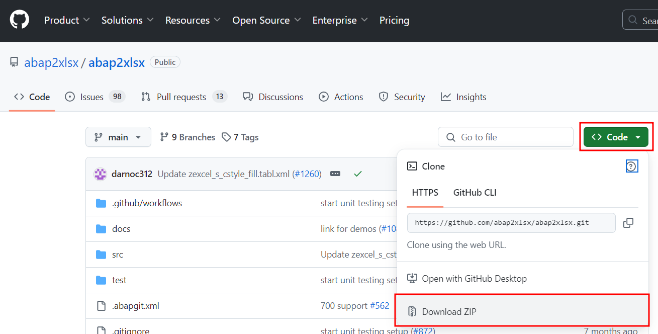 #02. ABAP2XLSX.ZIP을 다운로드하기 위해서 [Code] -> [Download ZIP]을 클릭해 보자.