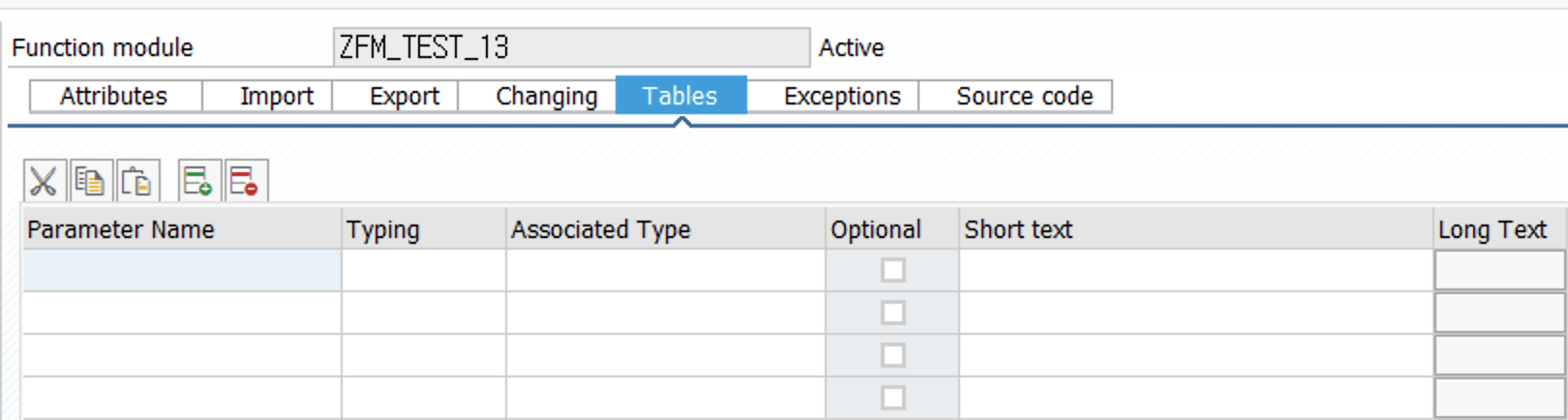 실행을 알아보기 전에 자주 사용되는 로직을 Function Module을 만들어주는 게 좋다. 실습으로는 콤마를 추가하는 Function Module을 만들 것이다. 일단 Tables Import , Export, Exception 세 개만 사용할 예정이