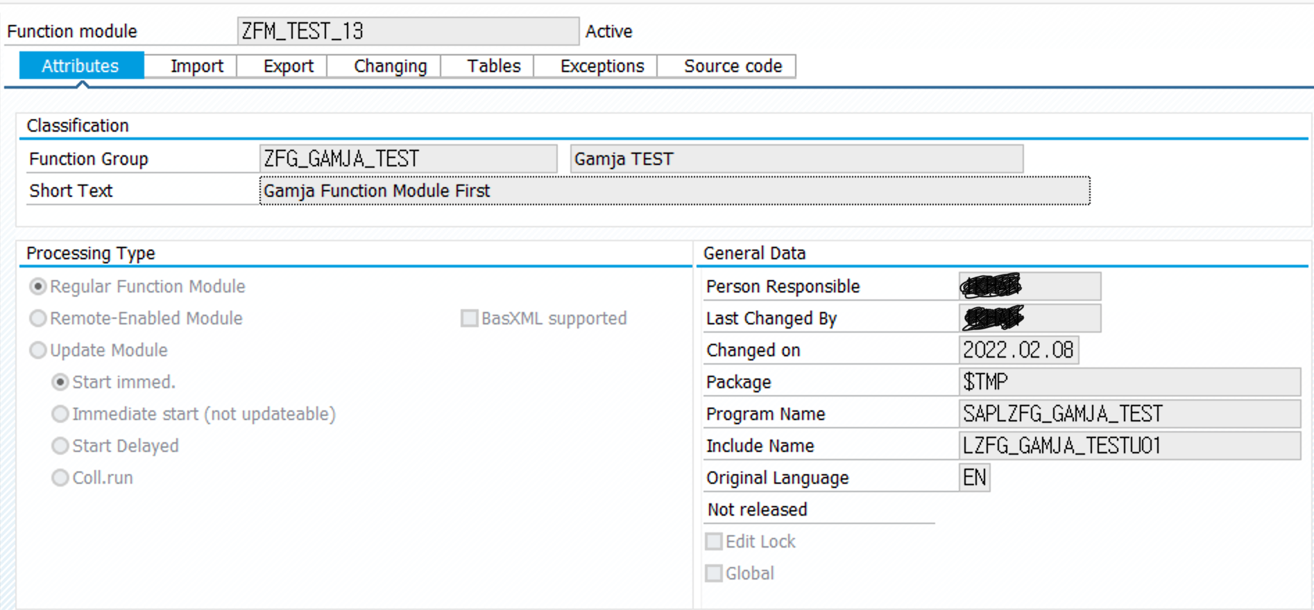 | Remote-Enablend Module | 동일 시스템 내에서 비동기적으로 호출되거나(예, 병렬처리) 다른 시스템(Not just R/3 Systems)으로부터 호출될 때 사용하며 이 항목이 설정된 함수를 RFC라 부른다. |