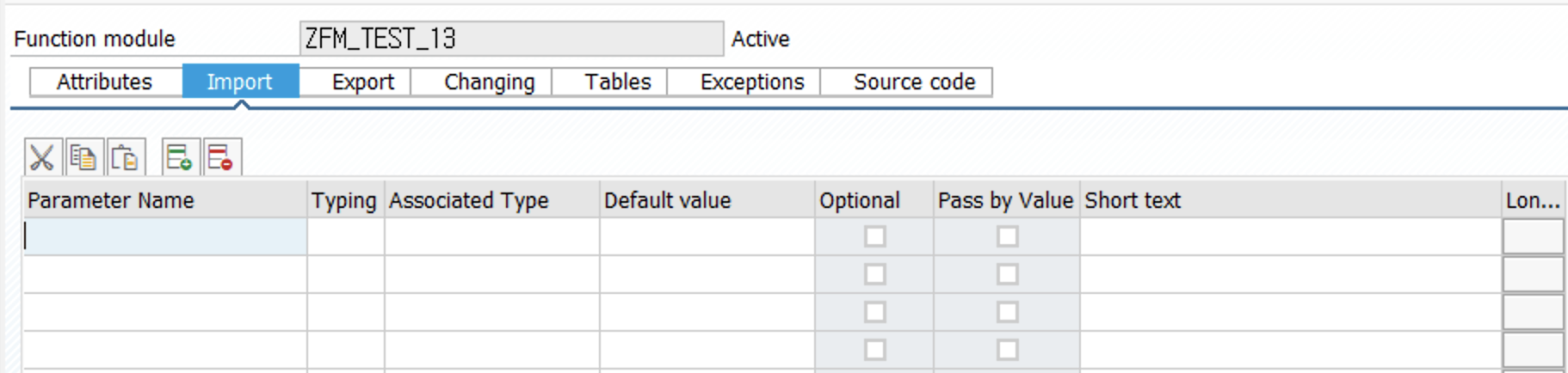 | Global | Global 플래그를 체크하면, Function Module 내의 변수를 Function Group의 Global 데이터로 선언하게 된다. |