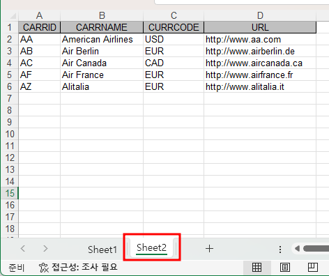 만약 다음과 같이 "Sheet2"을 읽어오고 싶을 때에는 다음과 같이 넣으면 된다.