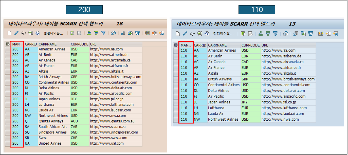 # ABAP 런타임 환경에서 SELECT을 하게 되면 자동으로 현재 클라이언트에 해당하는 데이터만 조회가 된다.