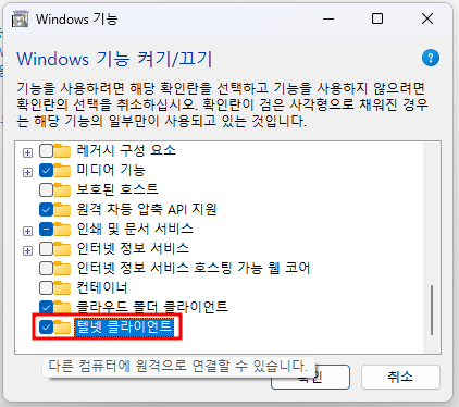 # 03. 밑으로 쭉 내리다 보면 [ 텔넷 클라이언트 ]를 체크하고 확인을 눌러서 활성화시켜 보자.