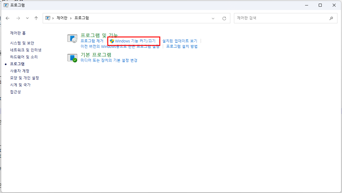 # 02. [ 프로그램 및 기능 ] -> [ Windows 기능 켜기/끄기 ]를 클릭