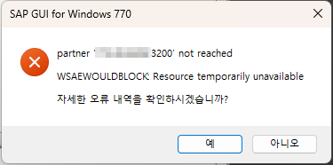 # SAP GUI 접속할 때 노트북을 새로 받았거나, 새로운 프로젝트를 나갔을 때, 서비스 팀에서 포트를 열었다고 했는데 다음과 같이 뜨는 경우