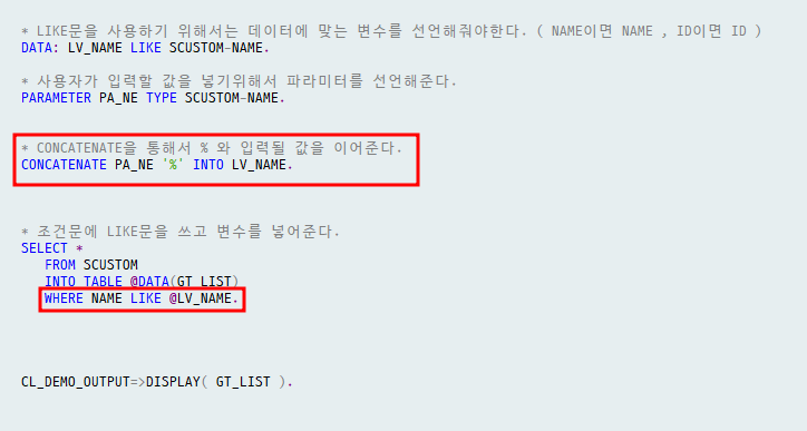 " 조건문에 LIKE문을 쓰고 변수를 넣어준다. "