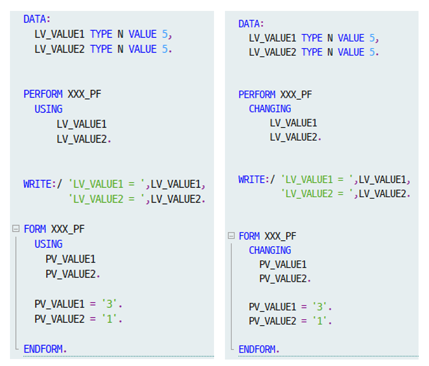 # VALUE문을 사용하지 않으면 USING과 CHANGING 하고는 똑같은 기능이라고 볼 수 있다.