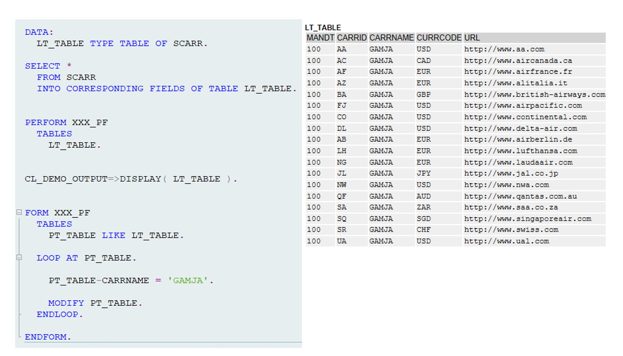 이런 식으로 인터널 테이블 넘겨줘서 서브루틴 안에서 값을 변경시킬 수도 있는 것이다.